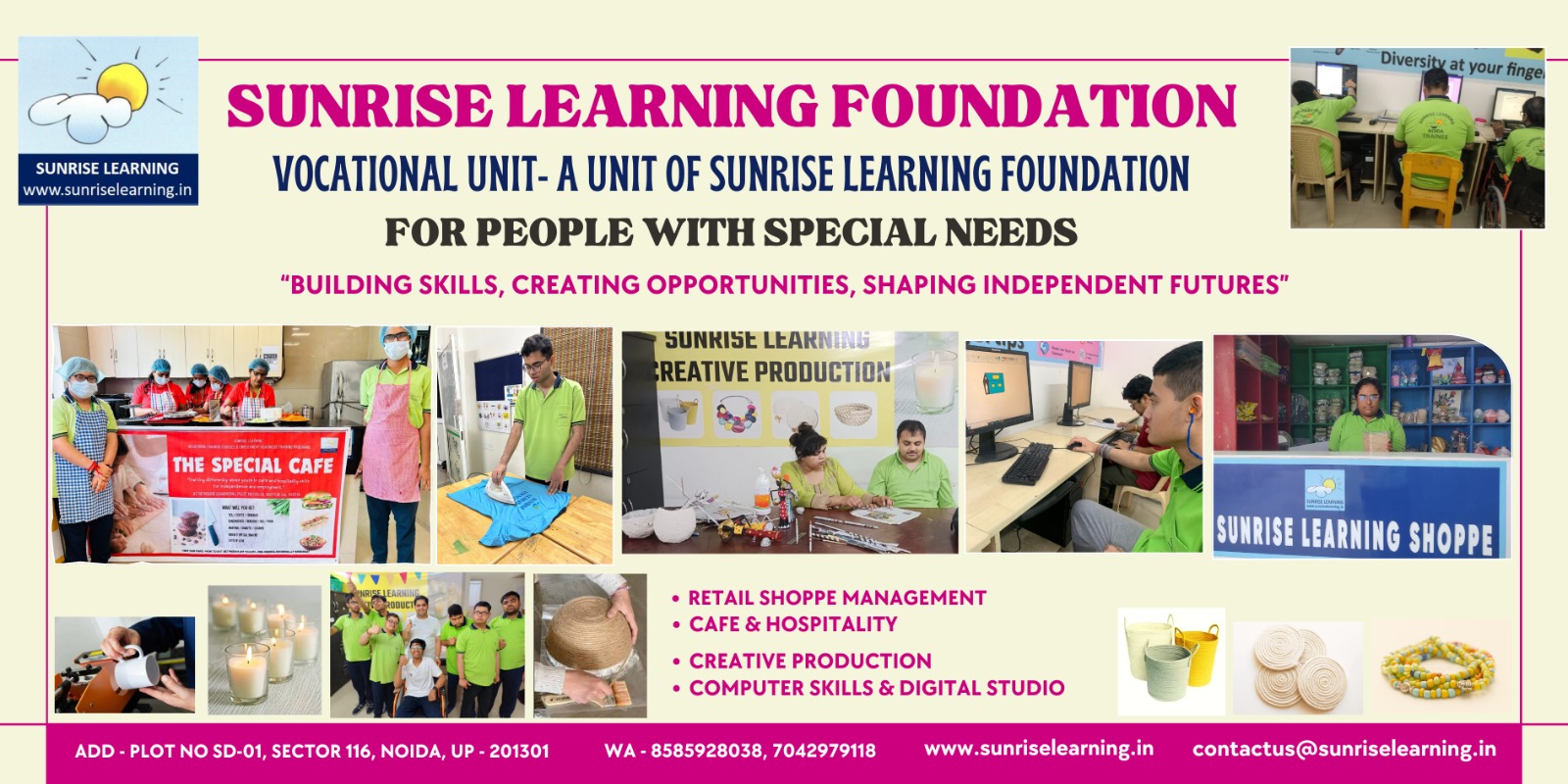 SUNRISE LEARNING is a special school in Noida that offers school programs to children & adults with autism & other special needs. We work with children as young as 2 years (in Early Intervention) to adults 30+ years (for Employment Readiness Trainings). We offer several school programs that nurture holistic development of children, and provide an inclusive social environment for learners to progress towards independence & dignity.